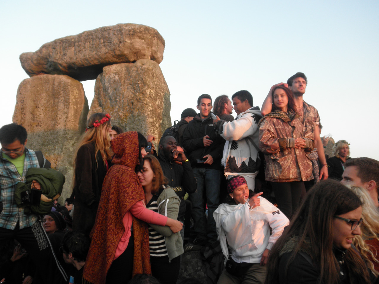 The druids floated around the entire venue, greeting one another like family at a reunion and silently watching over the rest of us. But they weren’t enforcers – that duty was definitely left to the understaffed security guards who struggled to push through crowds of people to control little fires of unrest. When a drunken attention-getter climbed to the top of one of the pillars, the druids I saw mostly took pictures and laughed while the security guards surrounded the stone perplexed as to how they might get him down. For such a large group of people, the event was largely peaceful – most offenses were from fireworks, alcohol, drugs, or strained nerves from lack of sleep – but those individuals who had taken the merriment too far were the exception, not the rule – it was a peaceful, ancient holiday and we were all here to enjoy it and each other. The most surprising thing to me were the druids themselves – that they still existed and practiced and wore these fantastic robes and costumes. The older men had silver beards and toothy smiles that made you believe Gandalf could be real. Their religion tied them to the land and in turn you could identify them as environmental activists, trying to keep the church they worship in free from pollution. At the sunset prayer as we cast “ohmmmmmms” in each of the cardinal directions, we were instructed to pray for (1) Peace in the Middle East, (2) the end of hunger and starvation in the world, and (3) the end of fracking. Of all the three things in the world to pray for, these druids had decided that stopping fracking had to be one of them. Throughout the long night, many of them held a rally at the edge of the field surrounding Stonehenge, taking turns standing in the center of the circle and delivering impassioned speeches, original poetry, acoustic songs, tales of horrible things already happening in the US, and commentary on British politics and corporations. This group was mostly lead by women. I understand how Environmentalism and Feminism (let alone Druid(ism?)) may cast your perception of how these middle-aged women must have appeared – but they were regal in their cloaks (and, yes, they shaved their legs and wore bras and had beautiful long flowing hair). The activist speeches were confined to those who wanted to listen and didn’t supersede the festival; the only hint you could find amongst the center of the mass of people was a US Native American tribal flag (couldn’t tell which tribe) that held some sort of symbolism for the druids and their anti-fracking movement that I never fully grasped.
