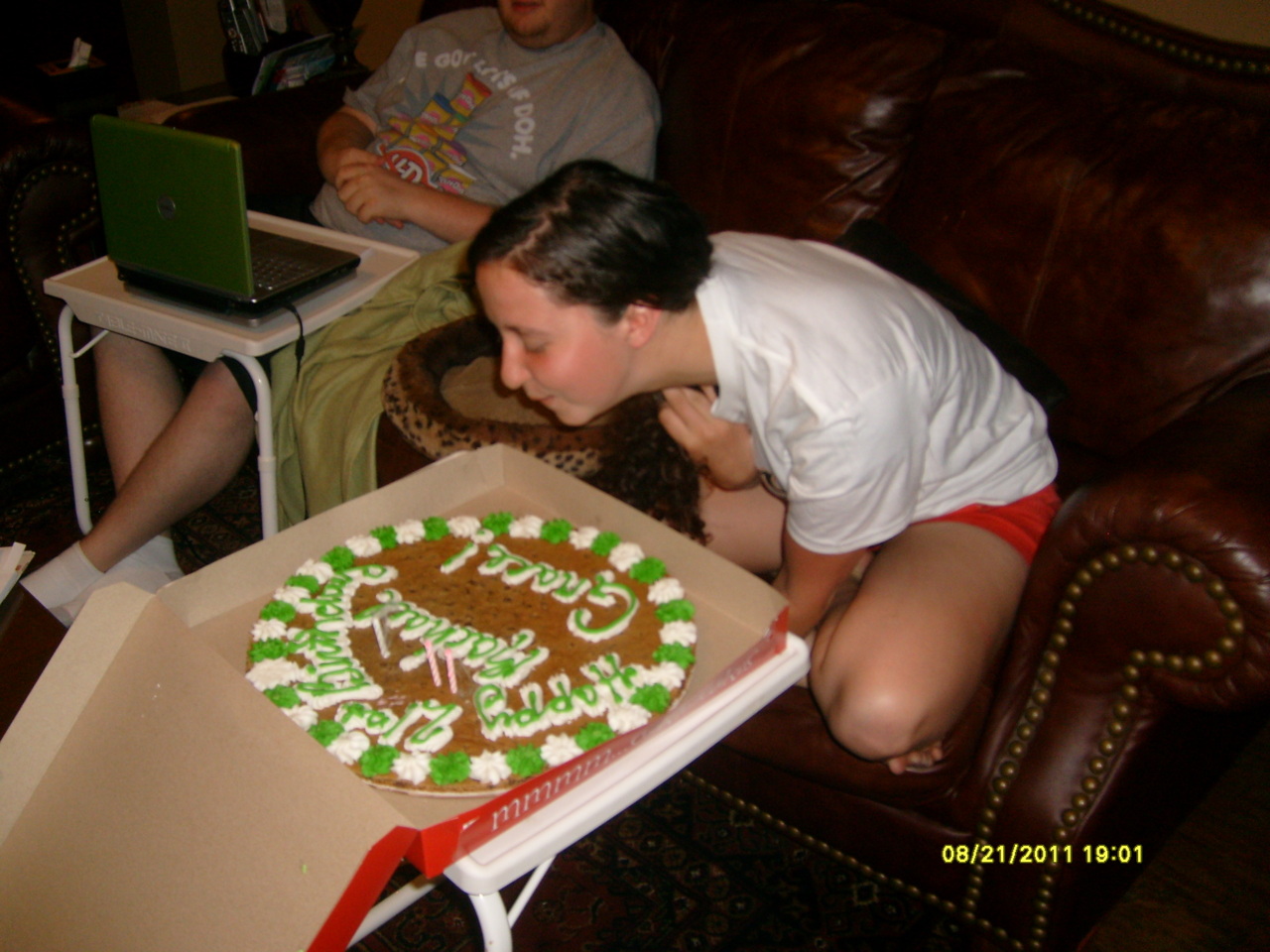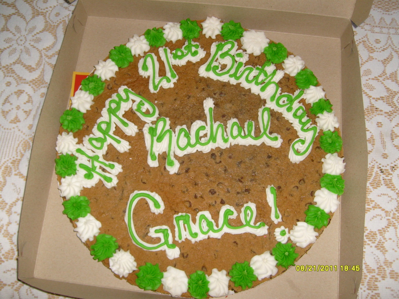 After dinner we all nestled back into my uncle’s couches, full and content. Though I am incredibly gullible and at times easily fooled, I can point to very few moments in my life where I have been legitimately surprised. This was one of those moments. From around the corner, Donna, who had been shuffling in the kitchen for several minutes, suddenly emerged with a glowing cookie cake, my name scrawled in glorious green and white icing letters across the front. In addition to a broad smile, my face soon also became adorned with a chocolate line stretching from cheek to cheek beside a corresponding milk mustache. I became even more stuffed, happy with the wonderful end to the evening. I cannot thank my family enough for all of that they do for me.